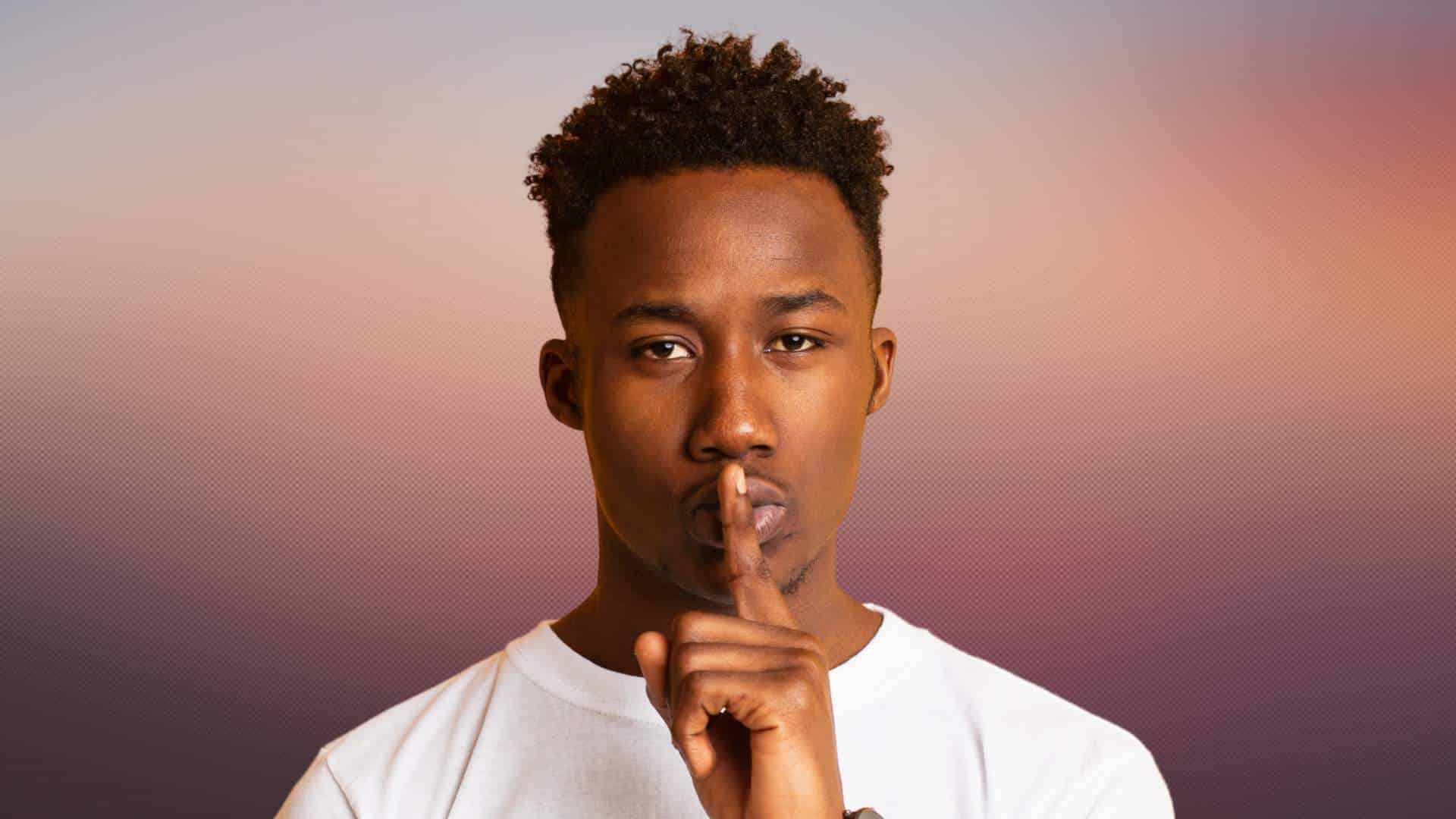 A young man puts his finger to his lips. (Photo by Konstantin Postumitenko, Prostock-studio)