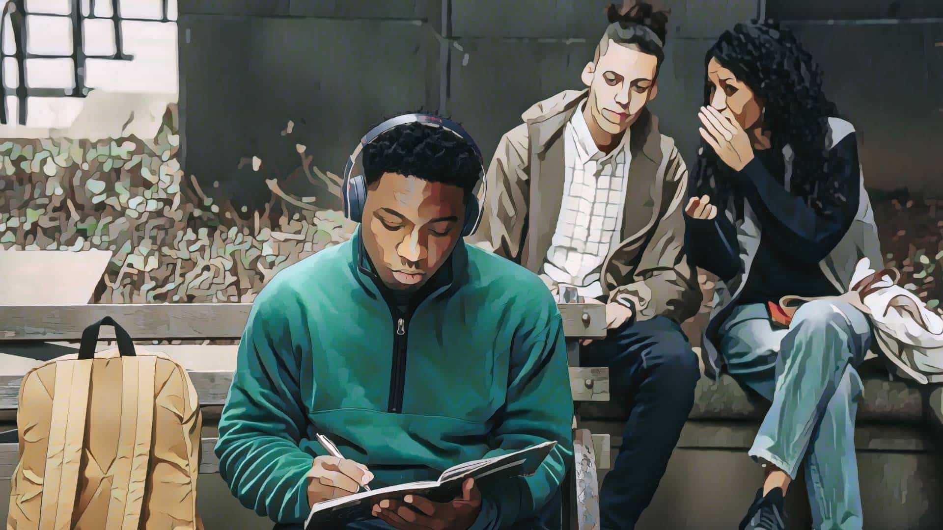 Two teens make fun of one who sits alone. (Illustration by News Decoder)