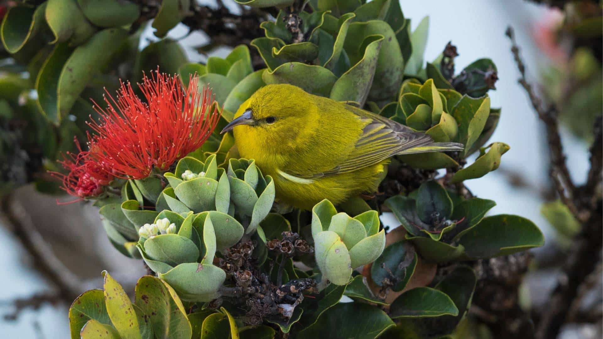 The Hawaii ʻamakihi in an ʻōhiʻa lehua tree. (Photos courtesy of the Maui Forest Bird Recovery Project)