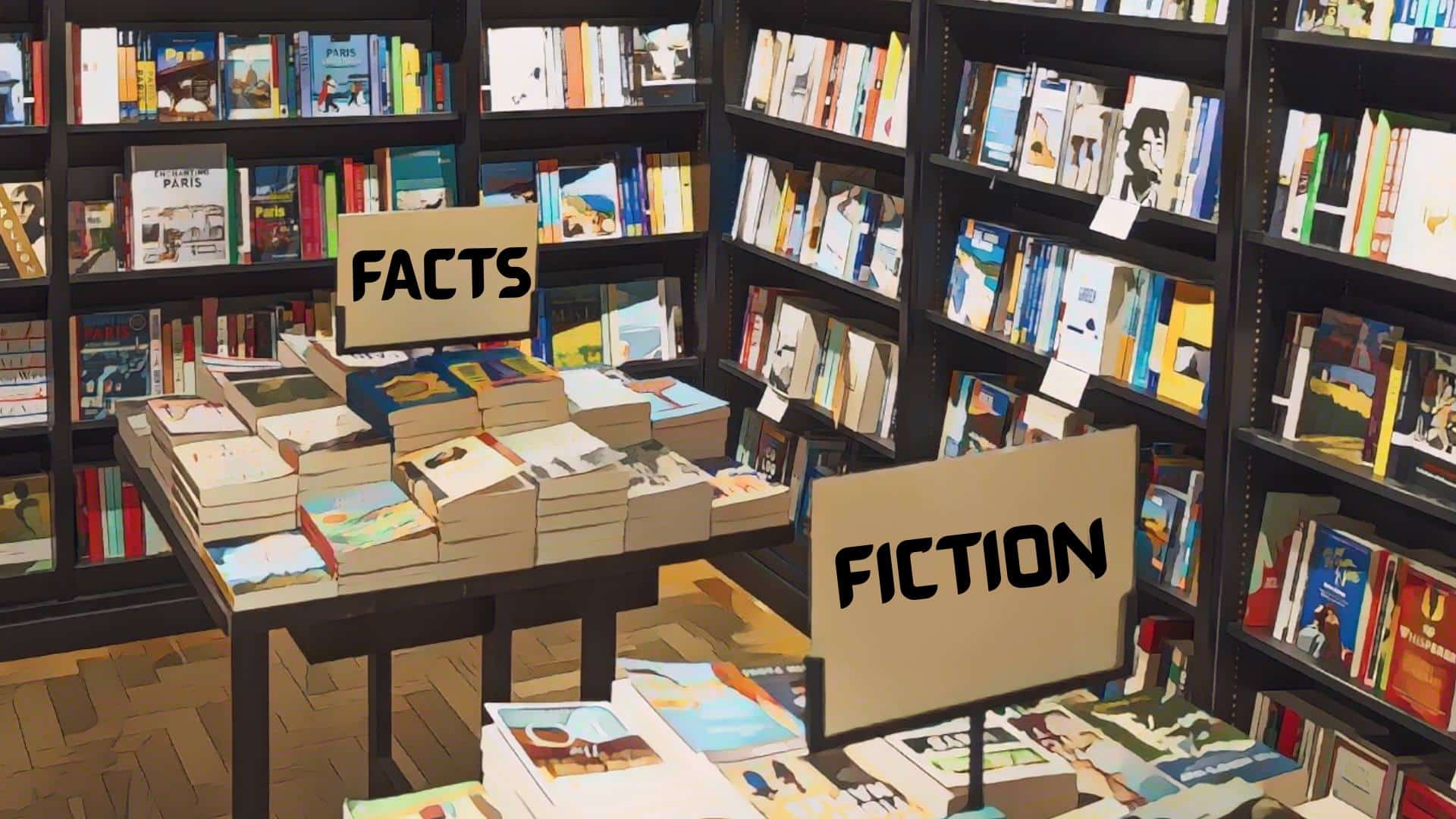 Two sections in a bookstore for facts and fiction. (Illustration by News Decoder)