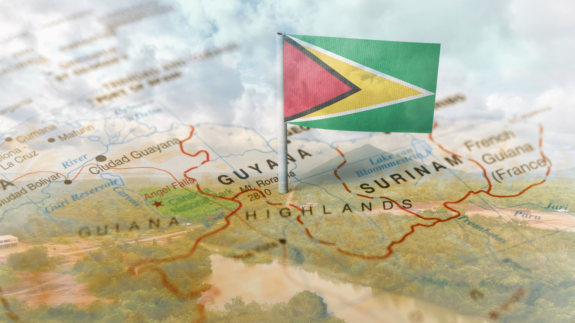 A photo of the Guyanese rainforest superimposed on a map showing Guyana. (Image adapted from Canva/Getty Images)