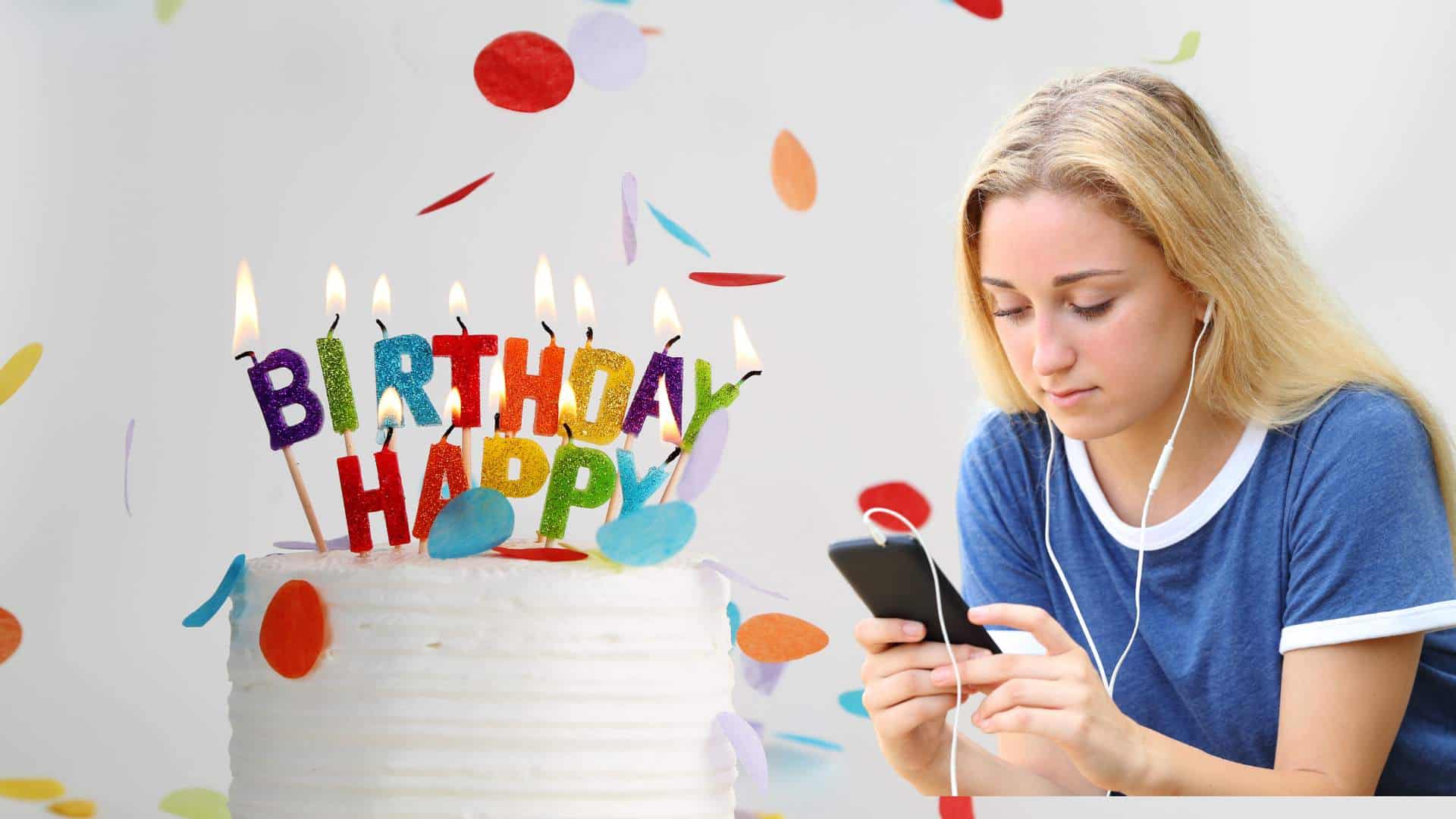 A teen on her phone ignores a birthday cake. (Illustration by News Decoder.)