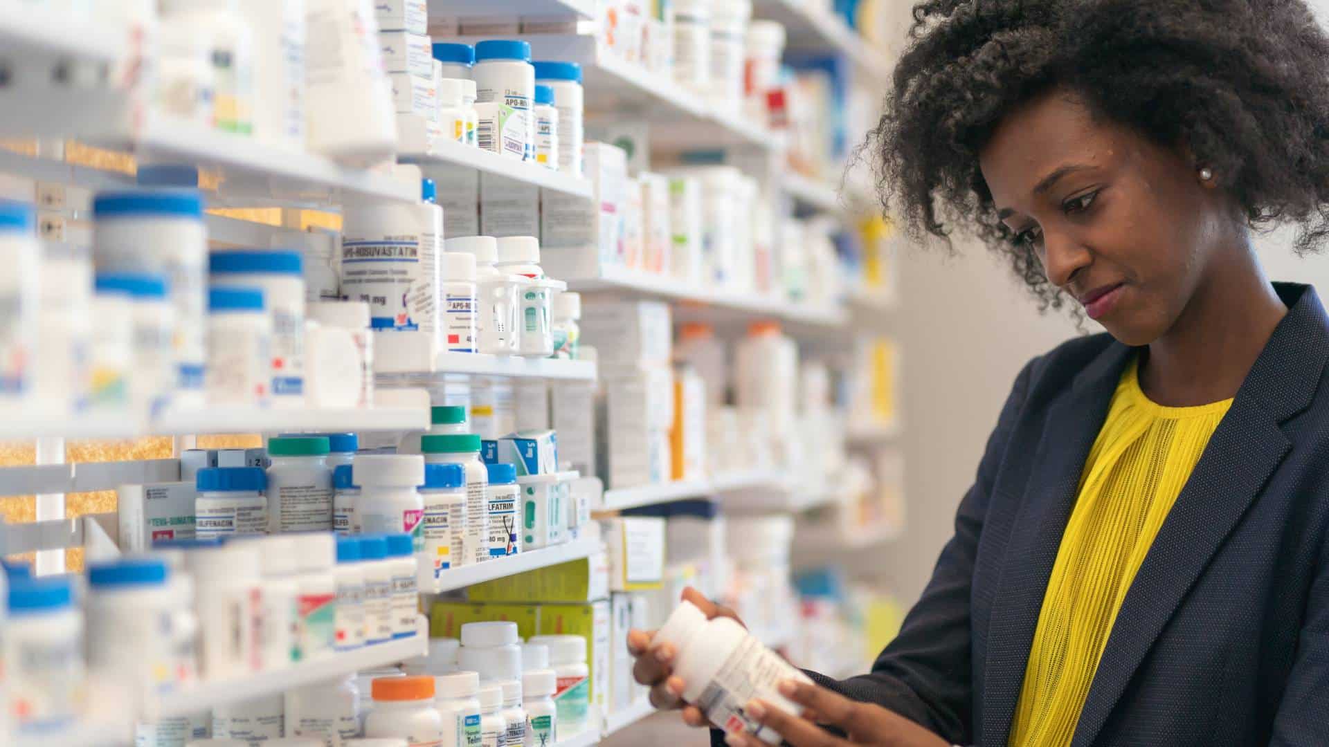 A woman considers buying a bottle of medicine off a store shelf. (Photo by FatCamera/ Getty Images Signature)
