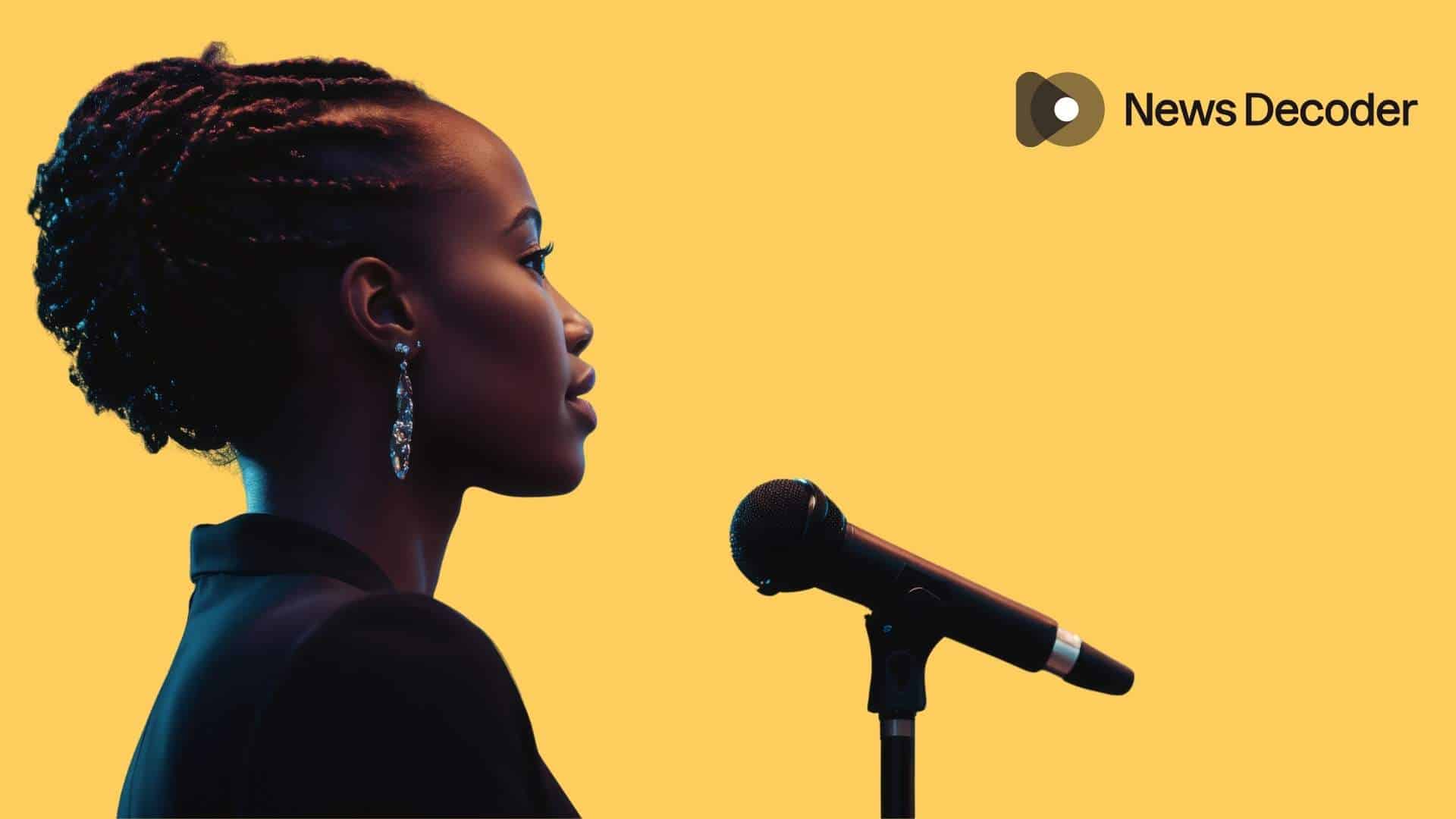 Video of the Decoder Dialogue on speaking out shows a woman at a microphone. (Illustration by News Decoder)